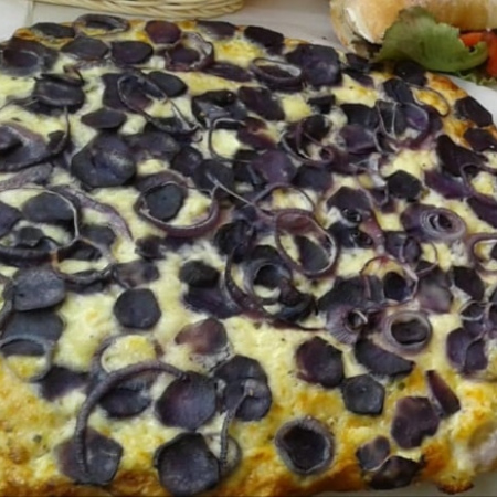 pomme de terre vitelotte(selon arrivage) , camembert, crème végétale, oignons rouges, emmental