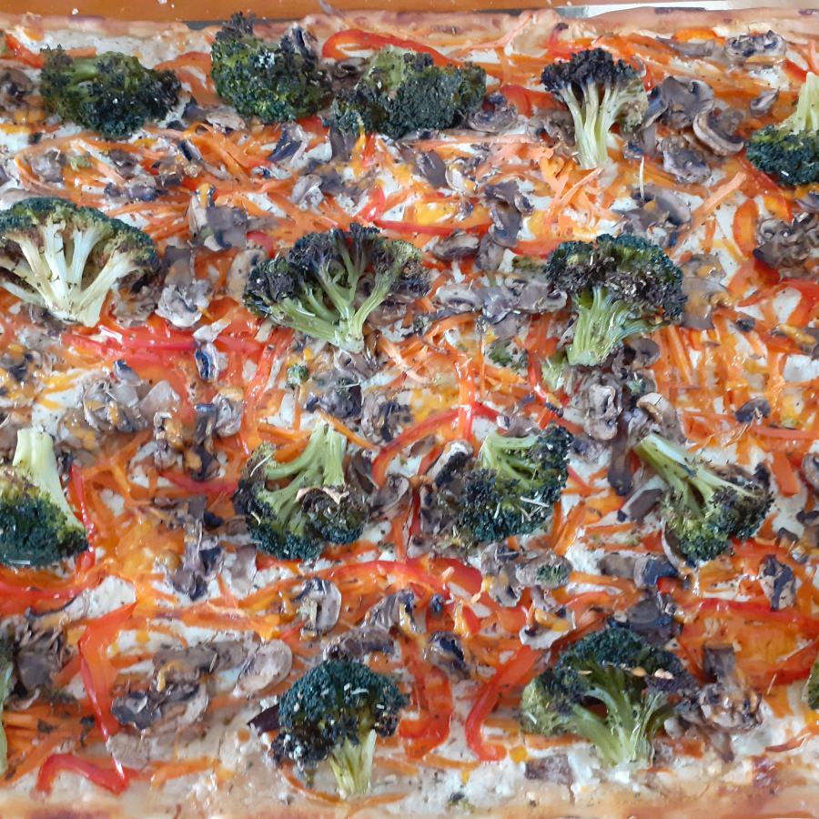 Champignons, brocolis, carottes, poivrons, fromage ail et herbes crème de soja, mimolette vielle